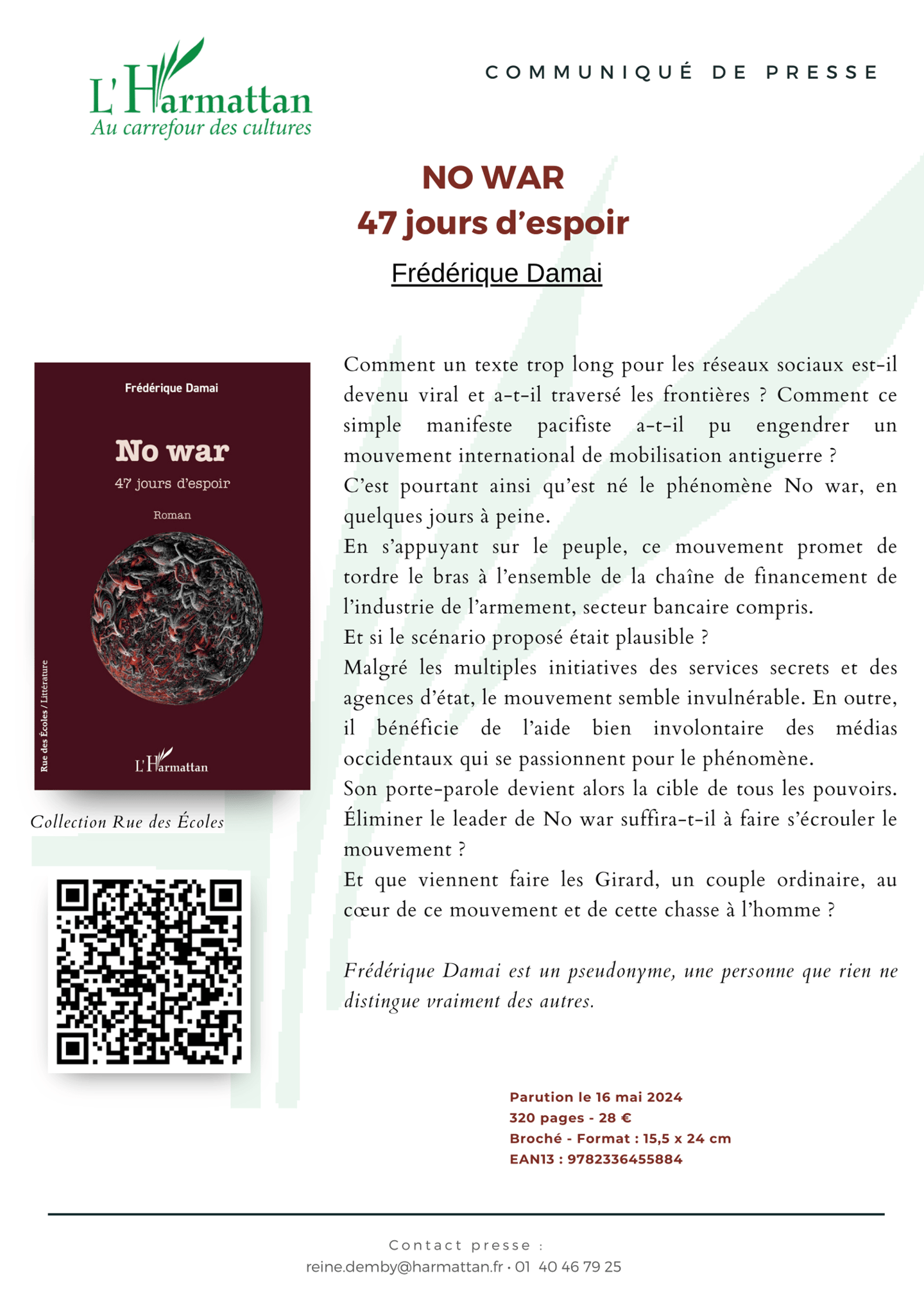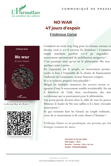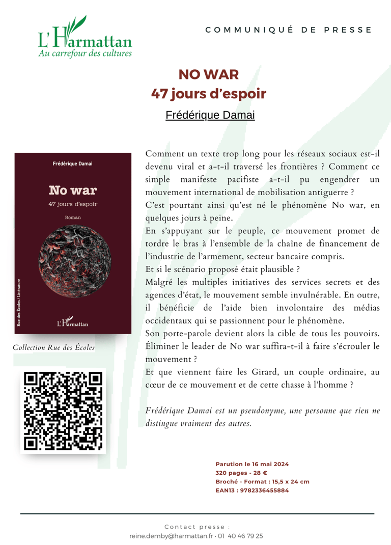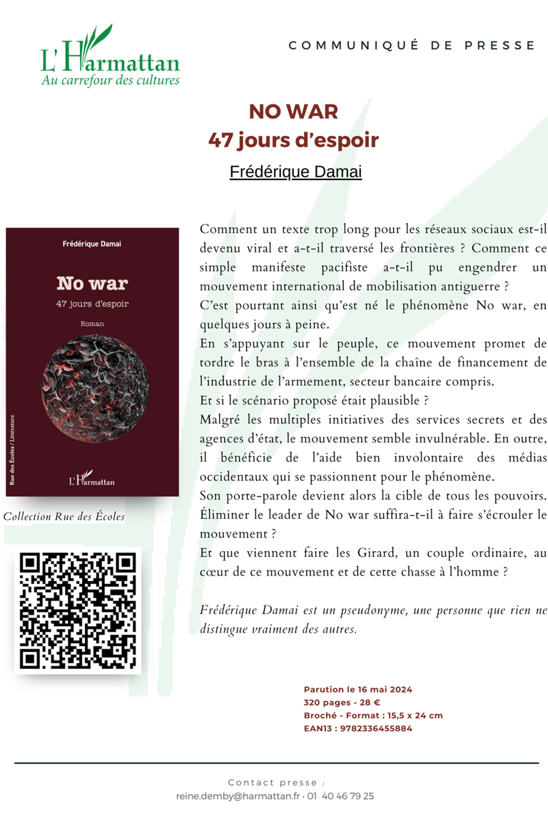 Un manifeste viral, des banques sur la sellette et une action populaire capable de changer l’histoire. Avec No war : 47 jours d’espoir, Frédérique Damai signe un roman qui nous pousse à une question troublante : et si la paix dépendait de nous ?