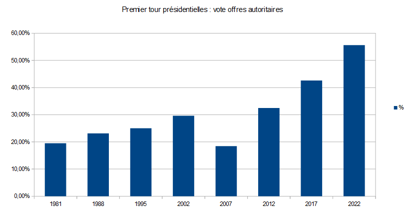Le résultat est éloquent et représente plus de 50 % de l'électorat en 2022. La parenthèse de 2007 est d'ailleurs riche d'enseignement et valide notre angle de lecture. En effet, le discours très « volontariste » et semi-autoritaire de monsieur Nicolas Sarkozy avait manifestement réussi à capter une partie de l'électorat à la recherche de cette tendance. Cinq ans plus tard, ce « charme » était rompu.